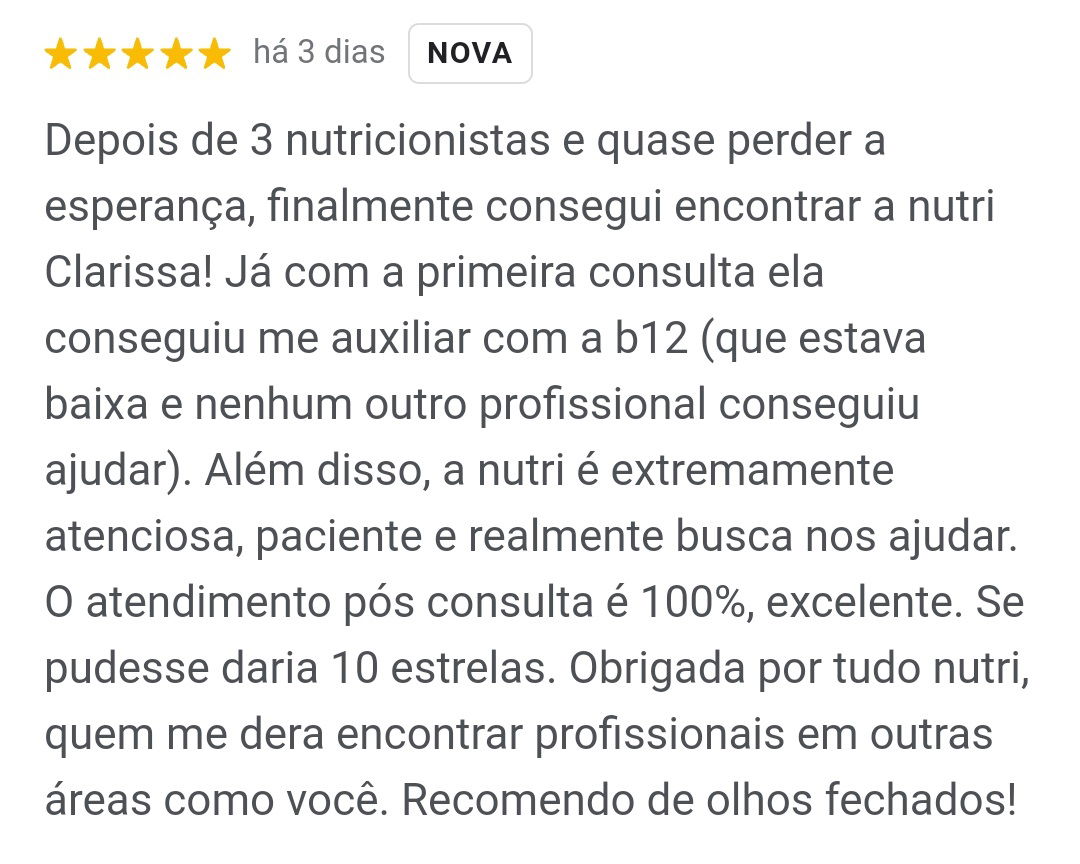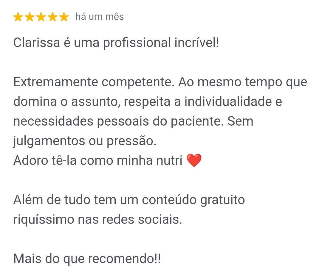 Durante 6 meses após a data de sua consulta, ficarei à disposição por mensagens pelo WhatsApp/E-mail para acompanhar suas evoluções, dúvidas, fazer ajustes de cardápios e acompanhar seus feedbacks. A ideia é que você se sinta feliz e confortável com sua alimentação, e não sentir que ela é uma dieta/ou uma obrigação complicada de ser mantida. Para garantir um atendimento pós consulta cuidadoso, costumo responder as mensagens de WhatsApp cerca de 2 a 3x na semana, assim consigo te trazer uma atenção de qualidade para que você não tenha dúvidas durante o processo.